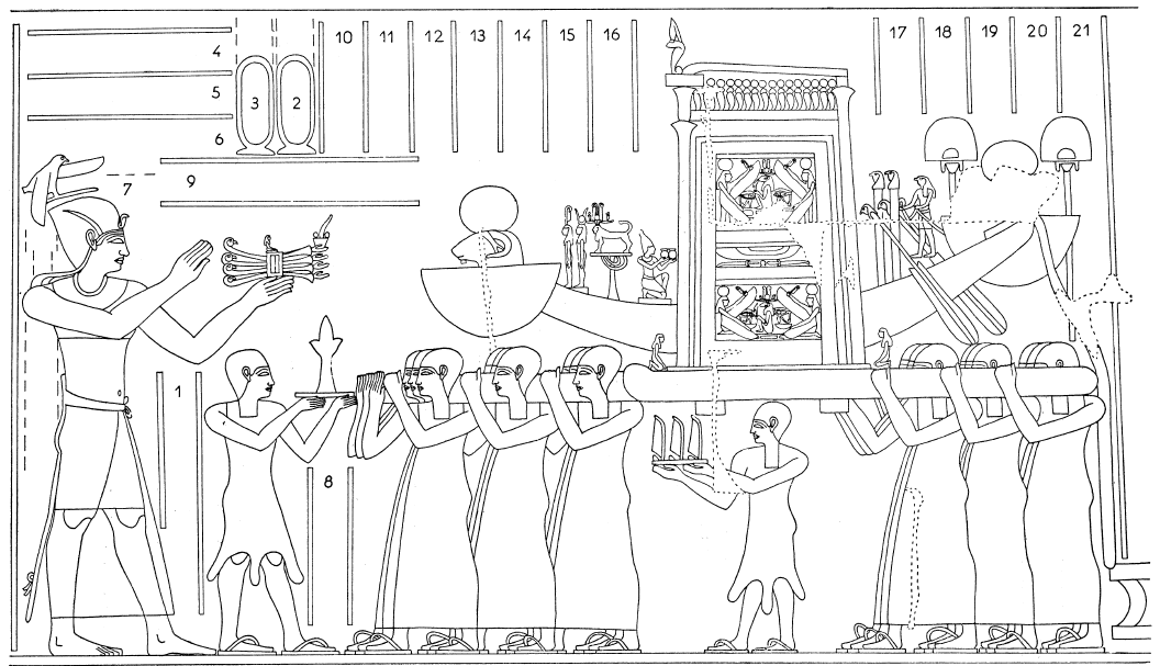 During this festival of “Lifting up Heaven”, Khnum is first associated with Ptah (artisan who uses the potter’s wheel), and then Shu-Heh who hold up the sky (identified here with the kiosk’s roof). The separation of heaven from earth by Heh (sportively alluded to in the spelling of Ptah’s name) is the preliminary step of creation, and the cosmic potter’s wheel supporting the sky then produces all living beings. For this complex network of religious concepts, see primarily Berlandini 1995.↩︎